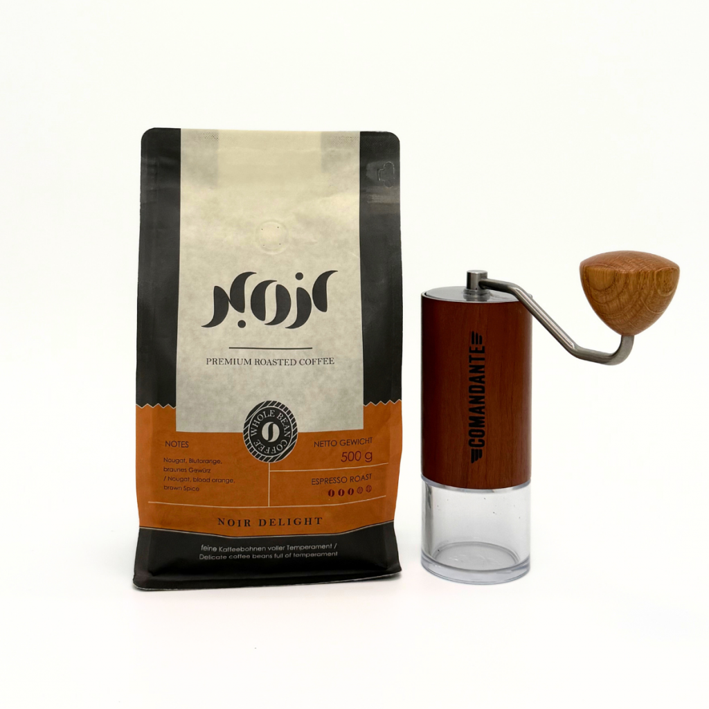 Erleben Sie Handwerkskunst und Geschmack auf höchstem Niveau: Dieses exklusive Bundle kombiniert die bewährte Comandante C40 MK4 Nitro Blade Handmühle mit 500g erlesenen Noir Velvet– oder Noir Delight-Kaffeebohnen vom Espresso-Club. Die Mühle ist ein Meisterstück deutscher Ingenieurskunst – mit bahnbrechendem Nitro-Blade-Mahlwerk für extrem gleichmäßiges Mahlergebnis, robuster Polymer-Glas-Bohnenkammer, kugelgelagerter Kurbel und stufenlos verstellbarer Mahlgradverstellung. Perfekt für unterwegs oder den täglichen Einsatz daheim.