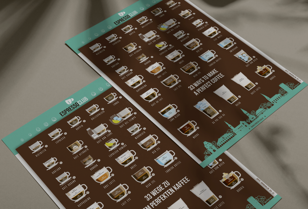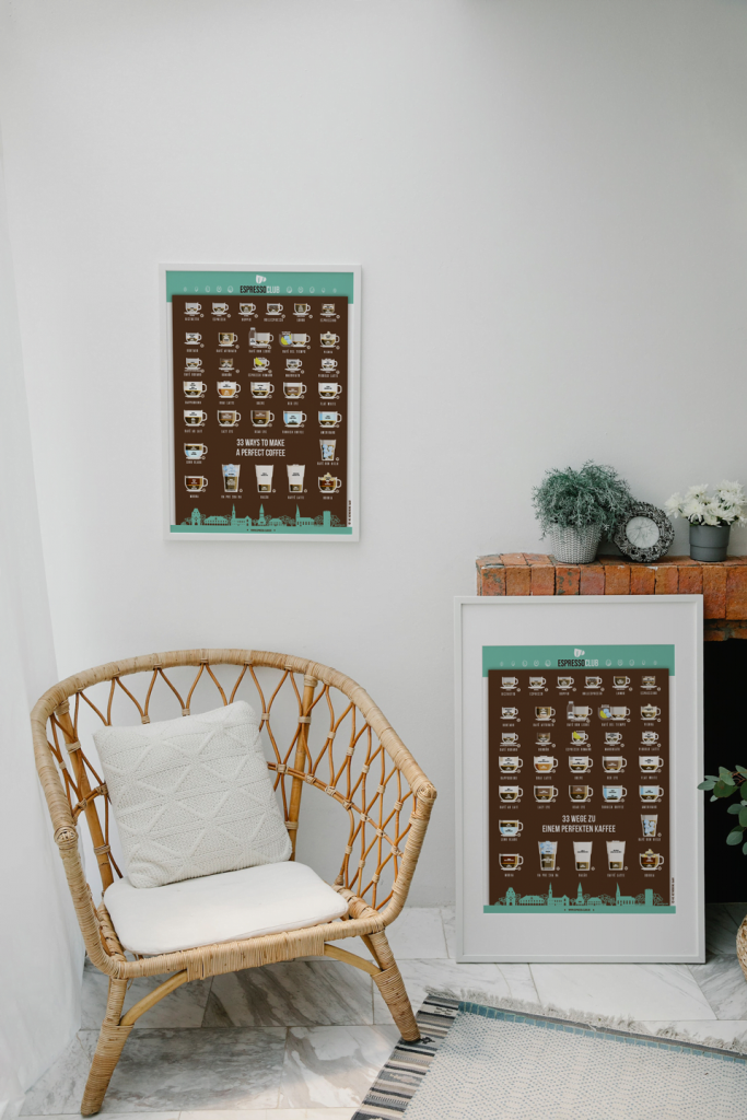 Das Poster Espresso Club im DIN A2-Format ist eine stilvolle Wanddekoration, die verschiedene Kaffeespezialitäten mit ihren Zutaten präsentiert. Ideal für Küche, Wohnzimmer oder Café und ein perfektes Geschenk für Kaffeeliebhaber.