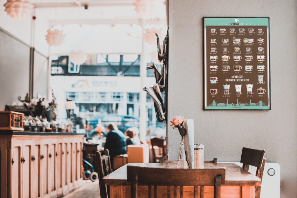 Ob in der Küche, im Wohnzimmer oder im Café – dieses Vintage-inspirierte Poster fügt sich harmonisch in jede Umgebung ein. Es dient nicht nur als dekoratives Element, sondern auch als praktische Anleitung für die Zubereitung von Kaffeespezialitäten wie Flat White oder Espresso Macchiato.