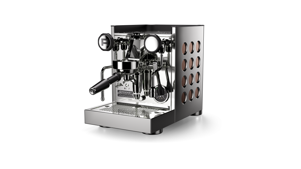 Die Rocket Appartamento Espressomaschine überzeugt nicht nur durch ihre Leistung, sondern auch durch ihr einzigartiges Design. Typisch für die Appartamento-Serie sind die seitlichen Cut-Outs in Kontrastfarben wie Kupfer oder Weiß, die dem Gerät einen modernen und eleganten Look verleihen. Ob in klassischem Edelstahl oder als Rocket Appartamento Serie Nera mit mattschwarzem Gehäuse – jede Variante ist ein echter Blickfang.